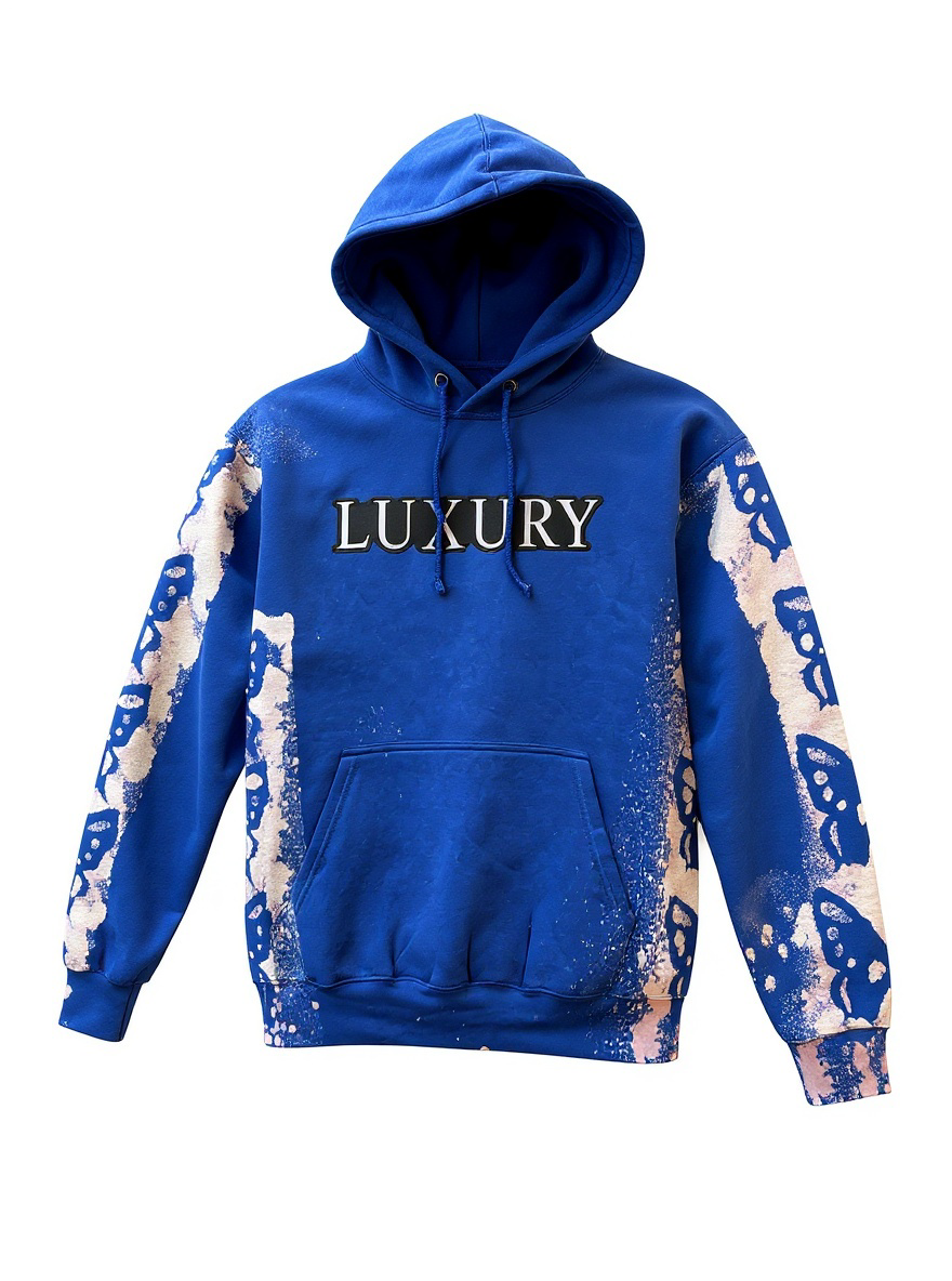 The vibrant royal-blue fabric is brought to life with a hand-applied bleach effect, forming a striking pattern that runs throughout the hoodie. Along the sleeves and sides, you’ll find a unique butterfly silhouette design, created through the bleach detailing—giving the piece a distinctive, eye-catching look. No two hoodies are exactly the same, making yours truly one of a kind.